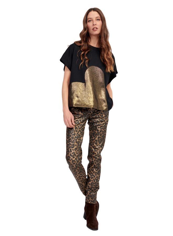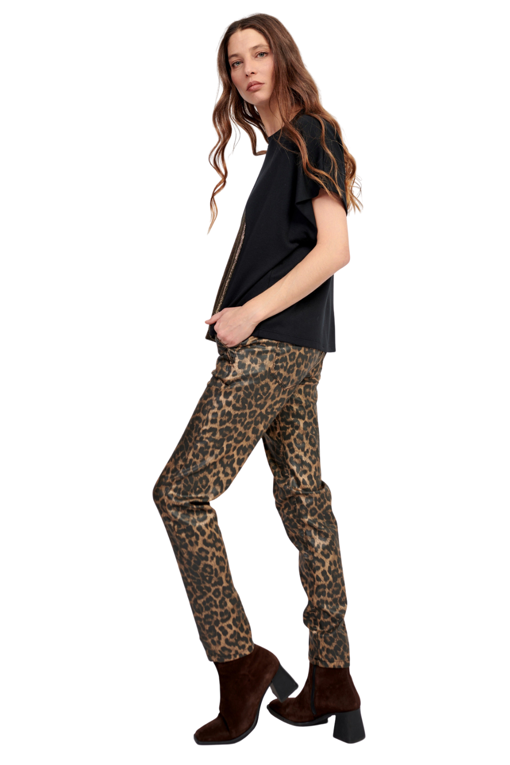 Drawstring stretch waist, mock fly, side pockets, yoked back with patch pockets, and rivet trim.
