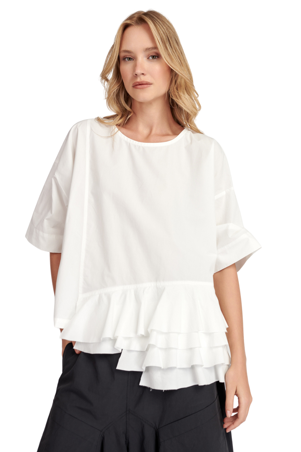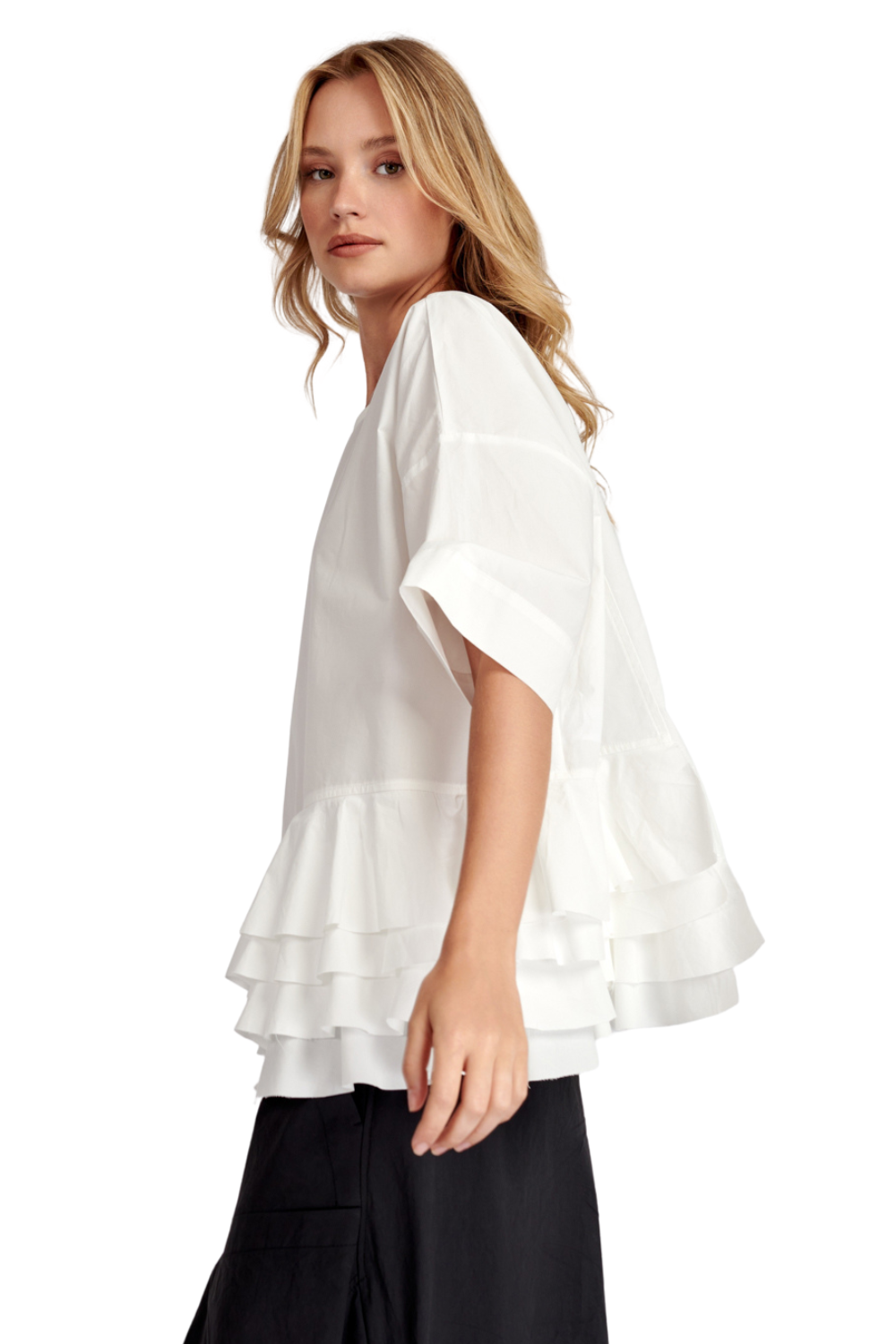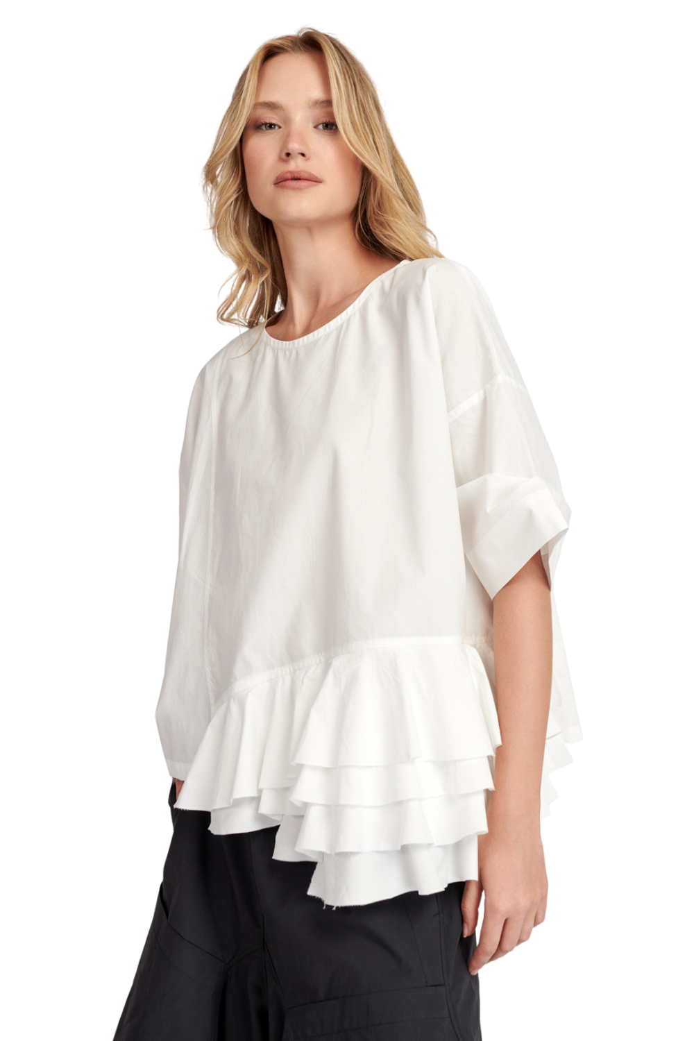 Loose elbow-length sleeve, asymmetrical tiered ruffles with raw hems