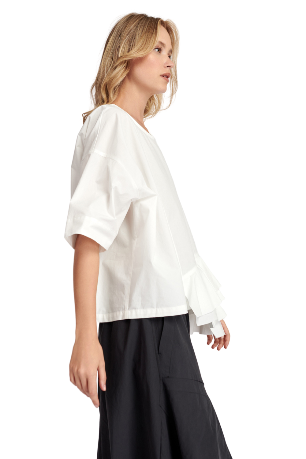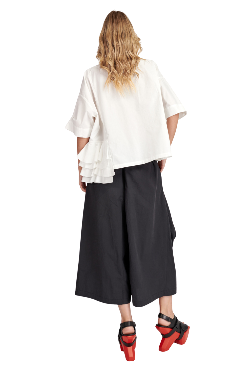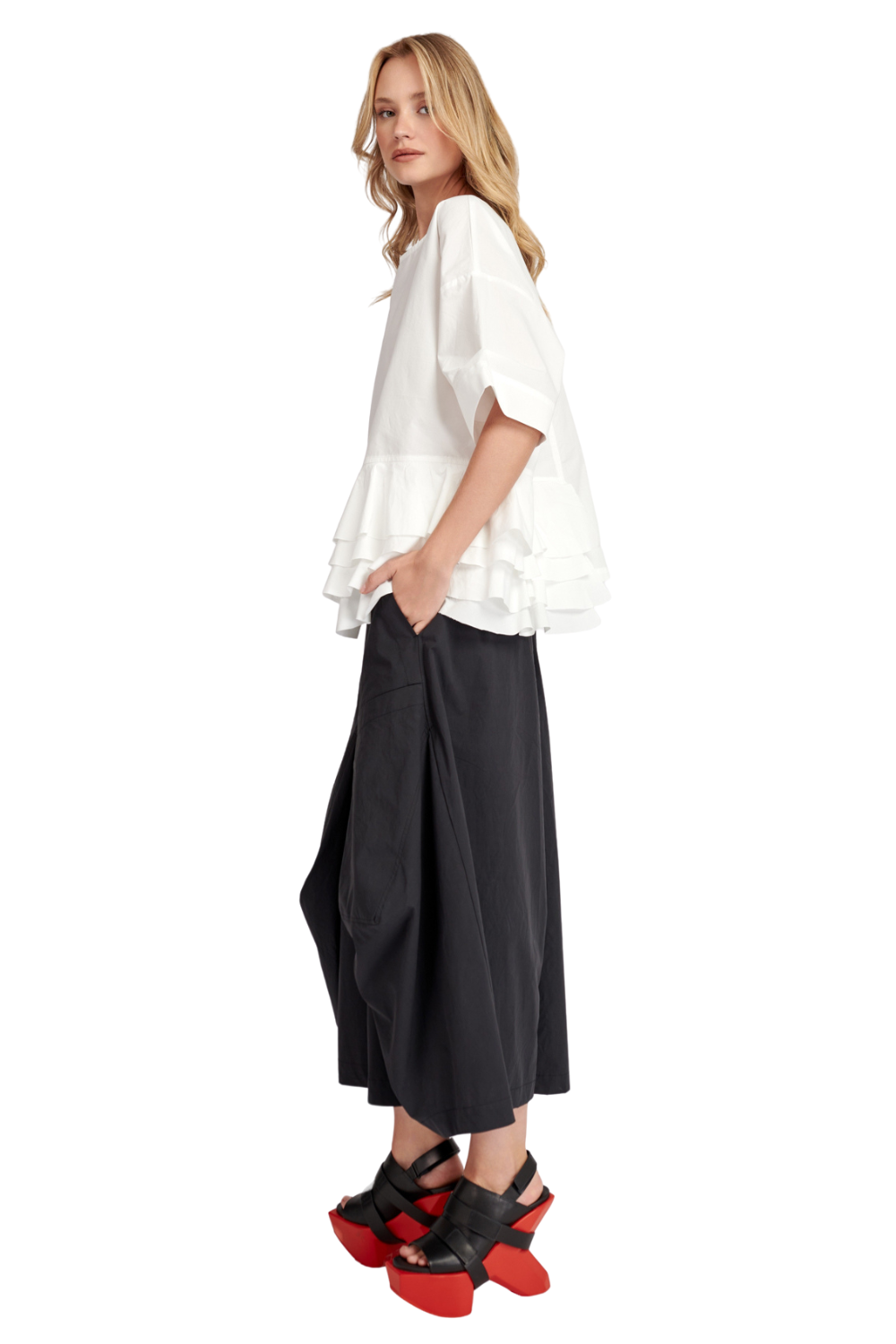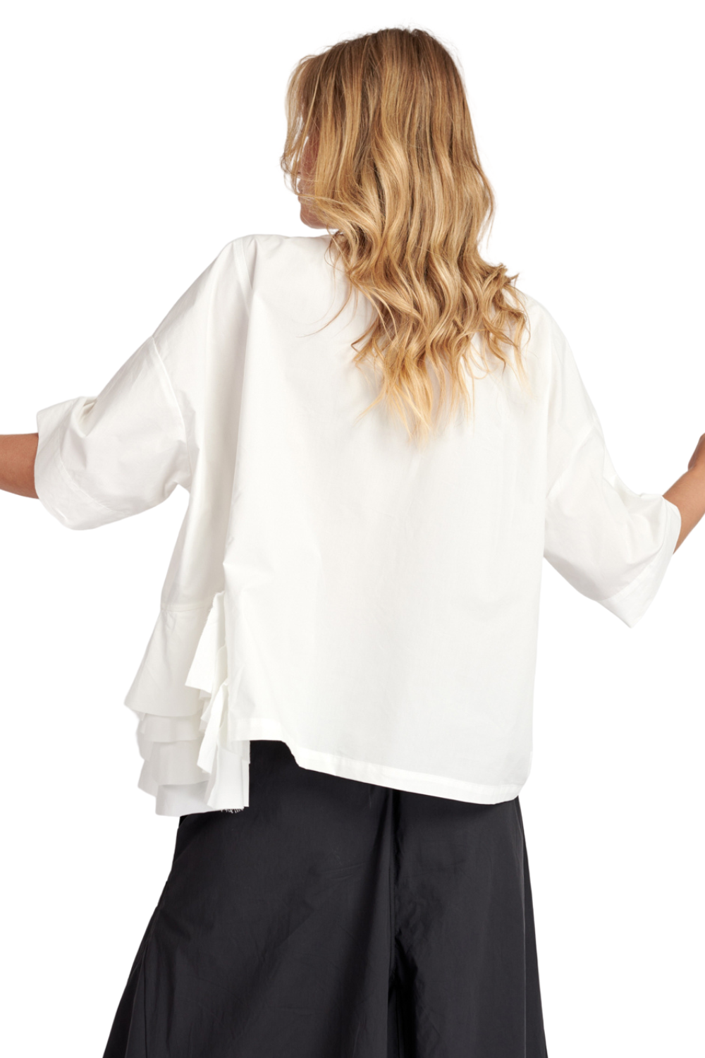 Loose elbow-length sleeve, asymmetrical tiered ruffles with raw hems