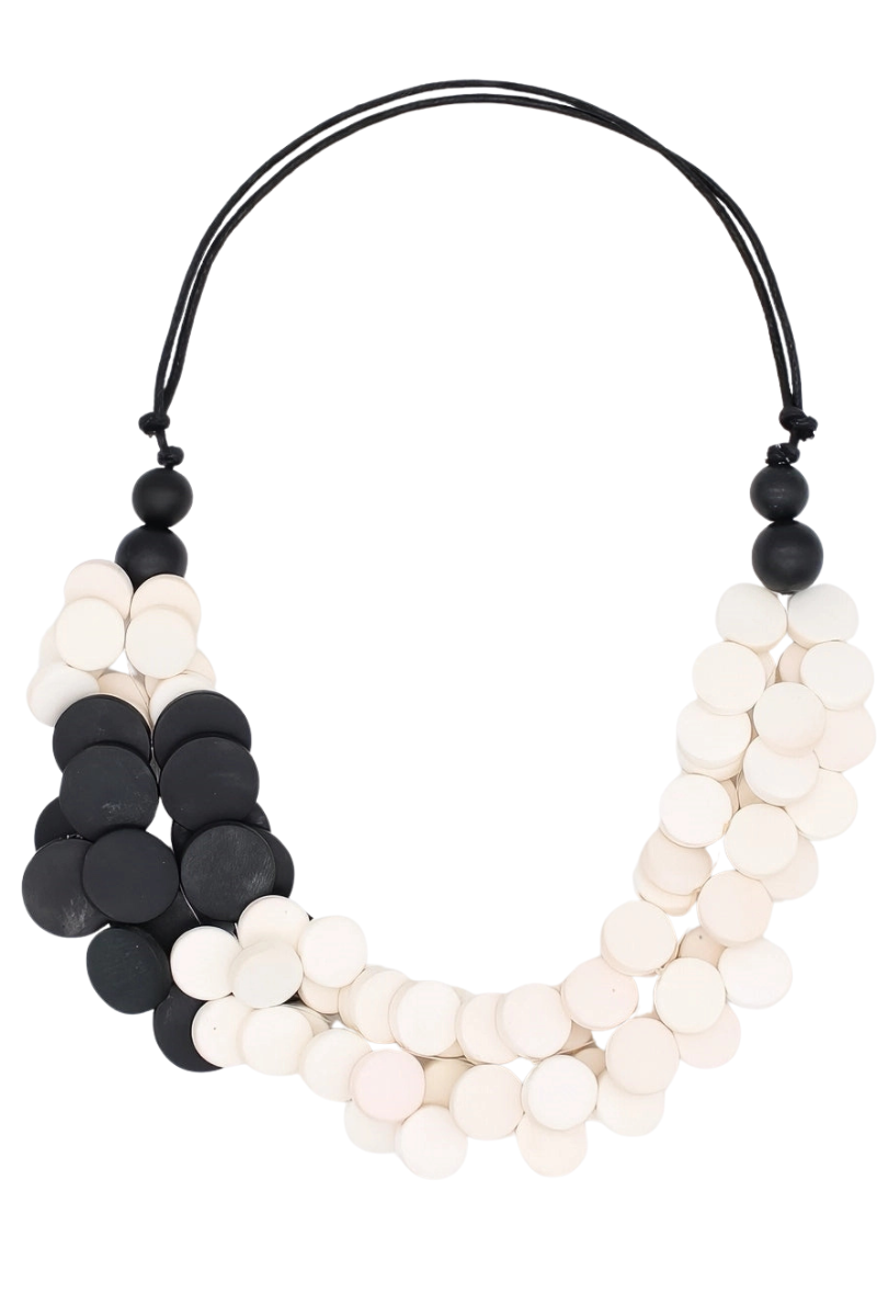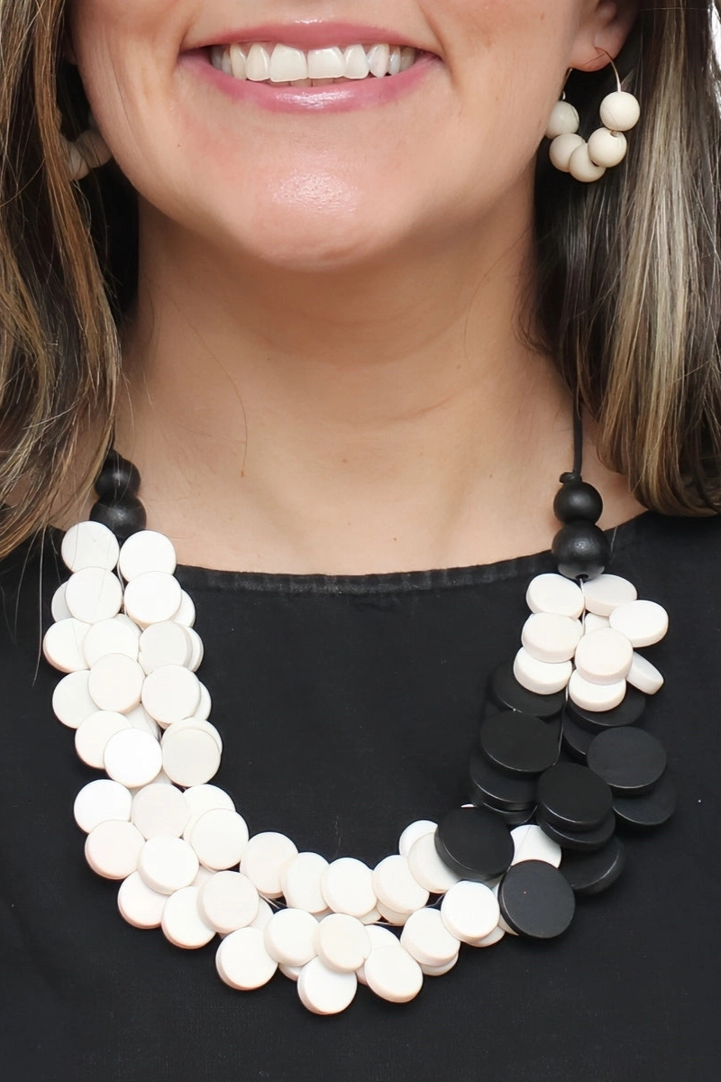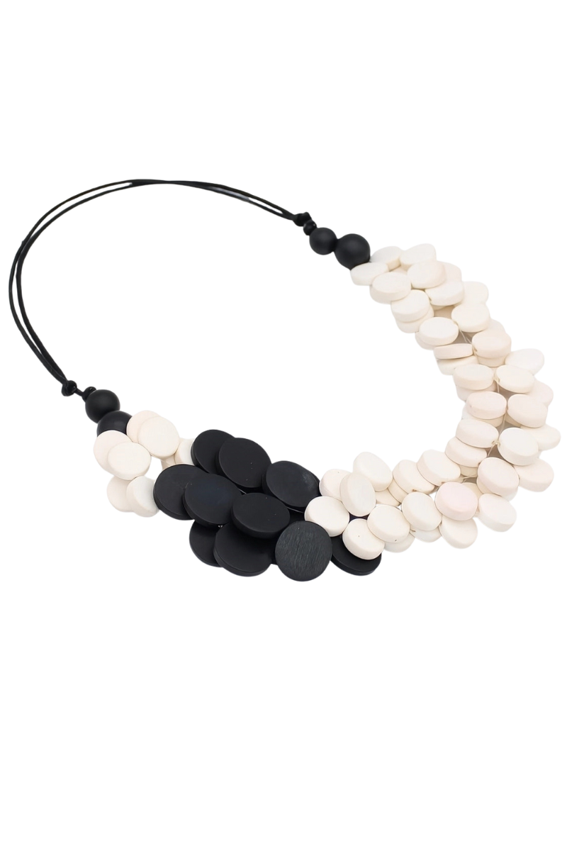 Featuring a clustered arrangement of jet black and luminous white beads, this necklace evokes the mesmerizing beauty of a solar eclipse. The layered design adds dimension and texture, while the monochrome palette keeps it effortlessly chic.