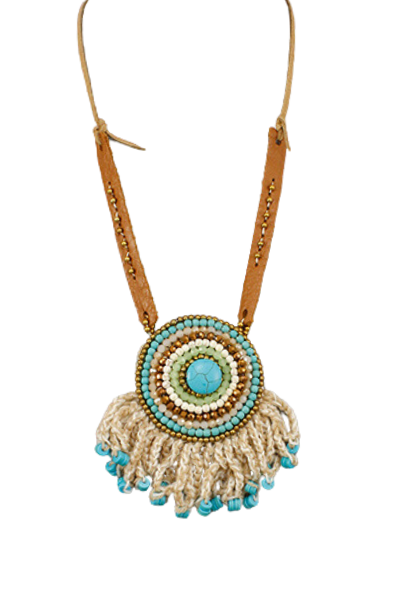 Boho Necklace(0) $45.00 Excl. taxArticle code: GSB75707Make a choiceDefaultMake a choice: *Default - $45.00Add to cartLogin for wishlistBuy NowDescriptionShareThis beautiful beaded medallion measures 3" across. Braided yarns are decorated with turquoise double beads. This is a perfect piece to take the ordinary to the fabulous! Facebook Pin it Whatsapp