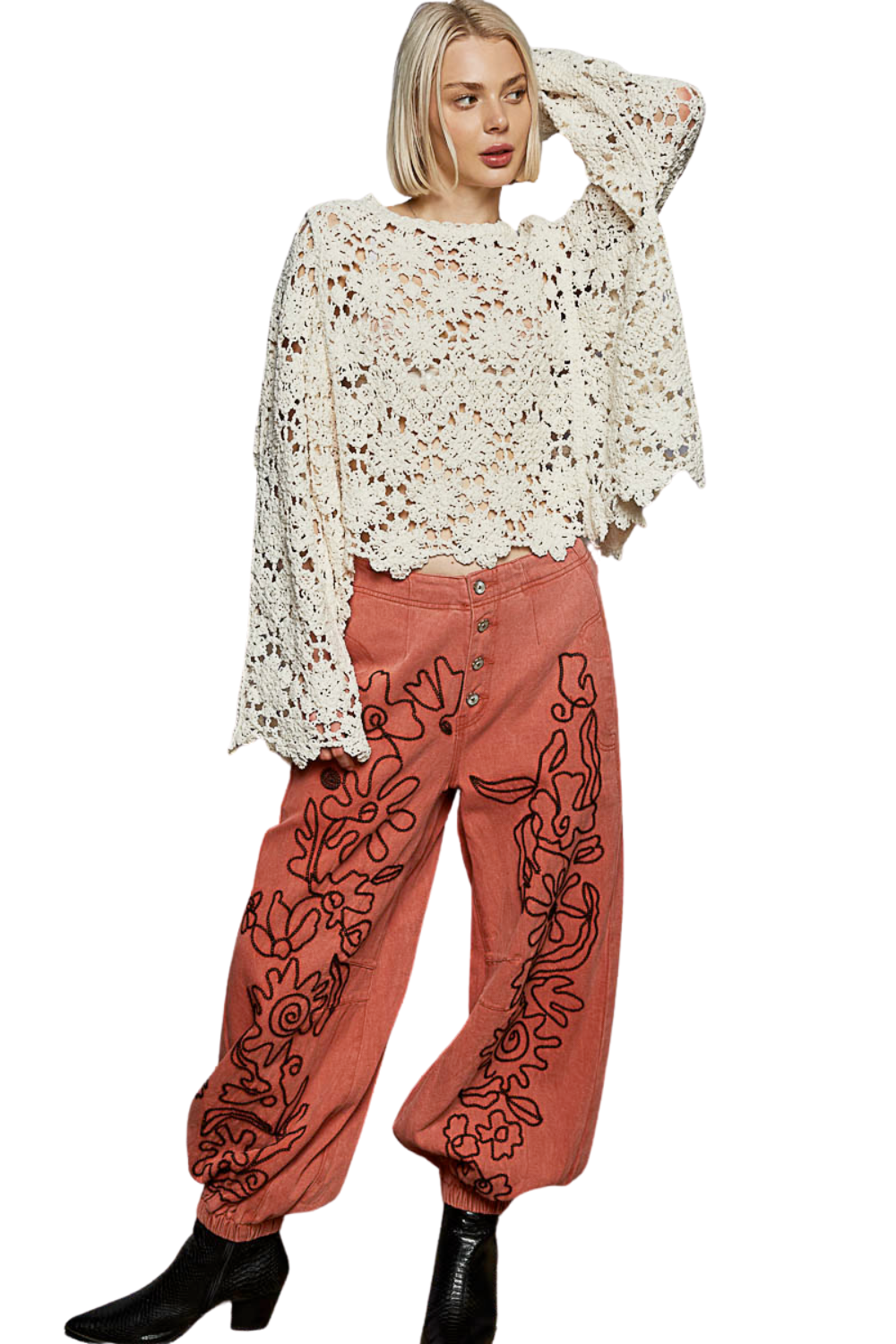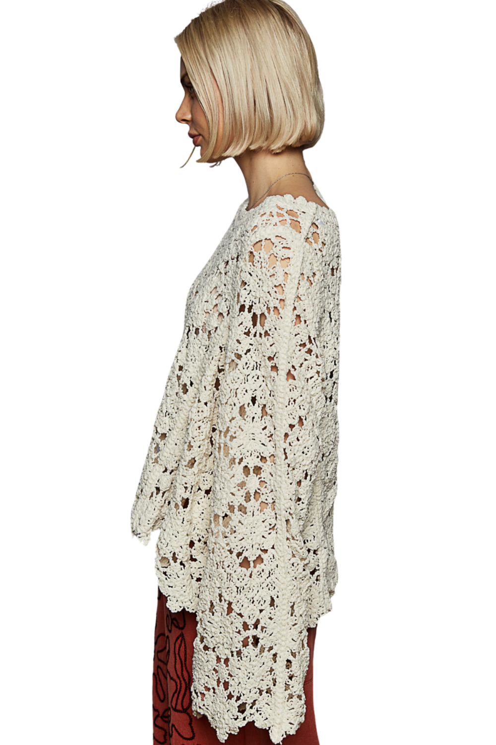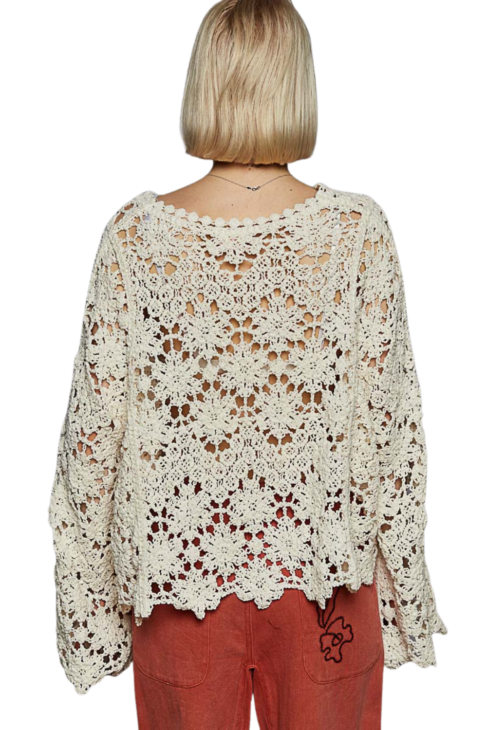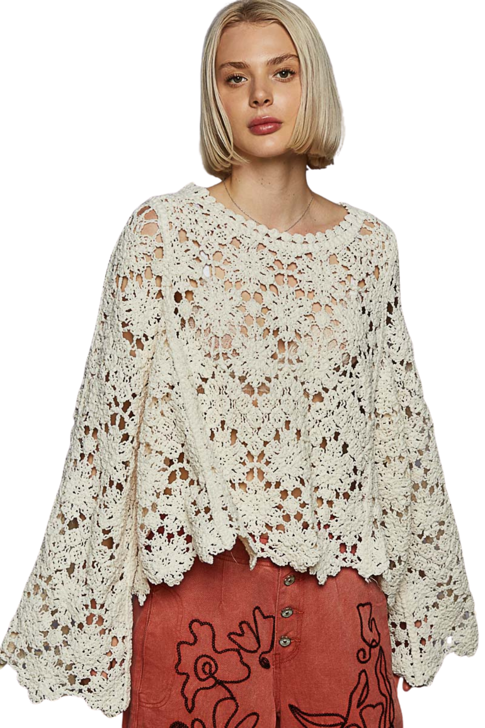Boho-inspired crochet knit top designed in soft chenille with scalloped hem and flare sleeves. Its oversized fit and floral open-knit texture create a relaxed silhouette — ideal for layering over camis or dresses for a chic, effortless look.