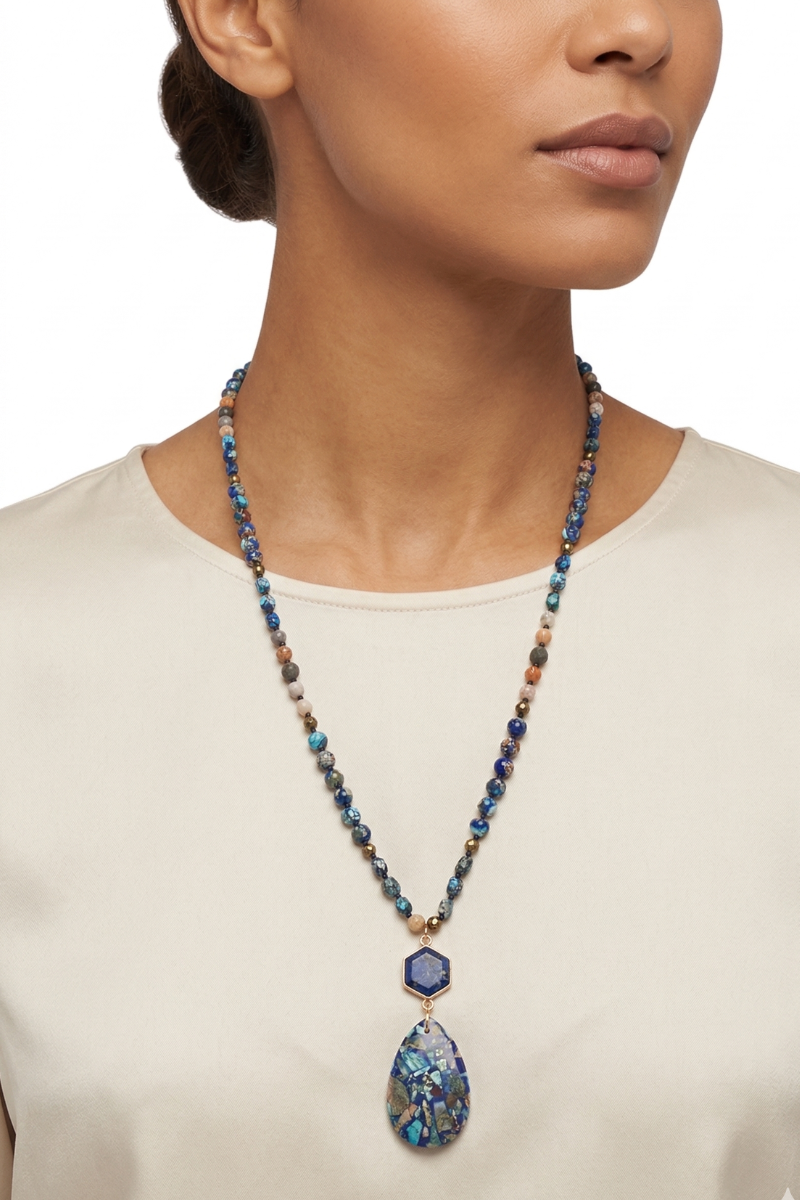 Dallas Necklace(0) $28.00 Excl. taxArticle code: SRNStone/PendantMake a choiceDefaultMake a choice: *Default - $28.00Add to cartLogin for wishlistBuy NowDescriptionShareMulti-colored blues blend together in this beaded necklace. The pendant is a tear-drop of embedded stunning stones. Facebook Pin it Whatsapp