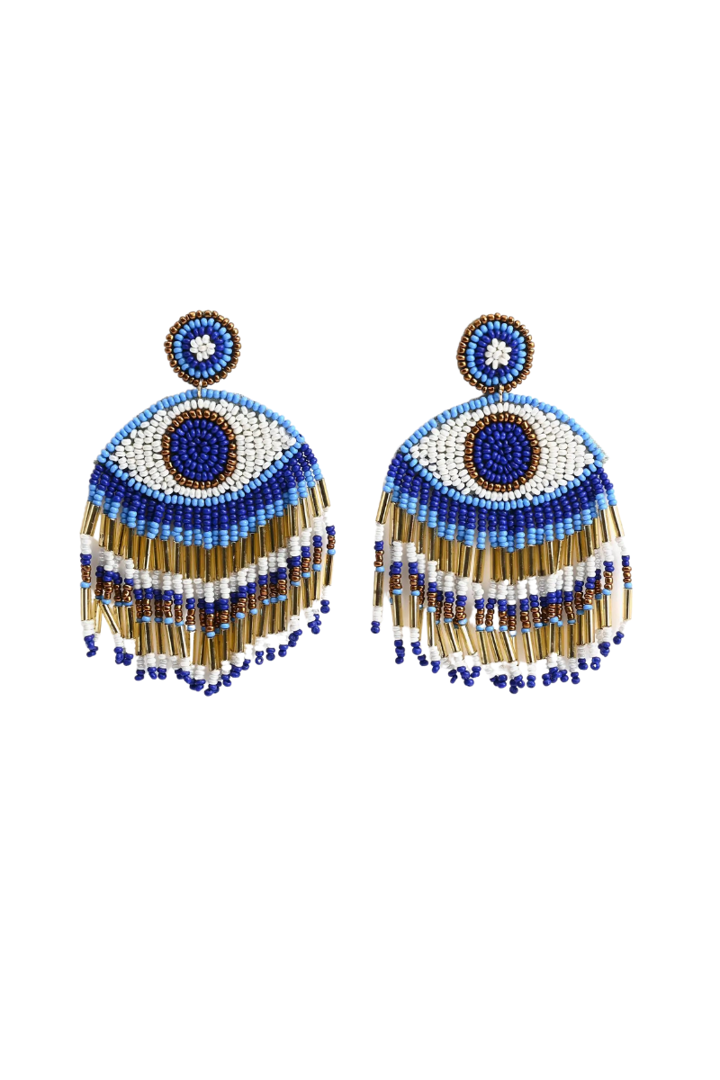 DetailsEvil Eye Beaded Earrings, Hand-beaded, crafted in beautiful colors of blue, gold and white3 1/2" in length