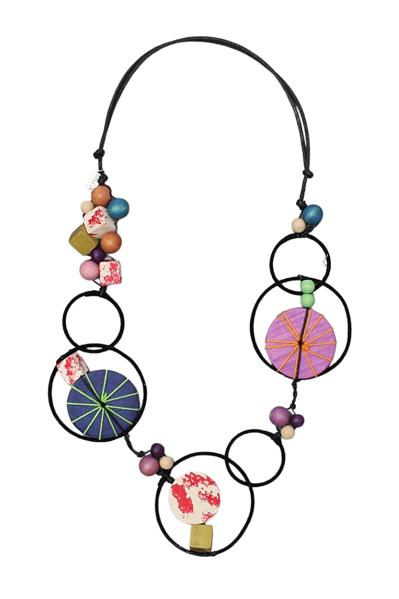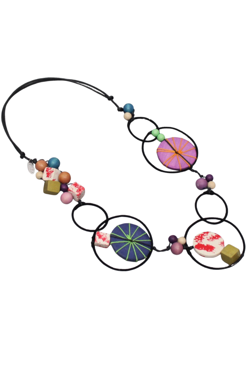 This multi color disk necklace features round metal loops covered with thread and accented with vibrant wood disks and cube beads throughout. Hung on an adjustable black wax cord, you can choose the length you prefer. The perfect color way to go with any outfit; try layering this necklace over a solid color tee or dress and pair with coordinating earrings!