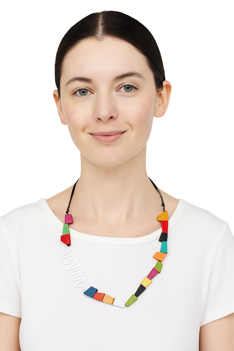 Made with cubist multi color wooden beads connected with a white rubber tubing all hanged off an adjustable black cord that will give any outfit that WOW factor you have been looking for. It is so lightweight you will absolutely forget that you have it on if it wasn’t for all the compliments you are sure to get.