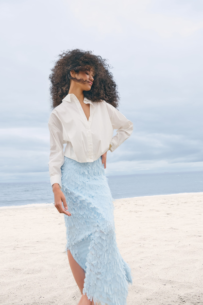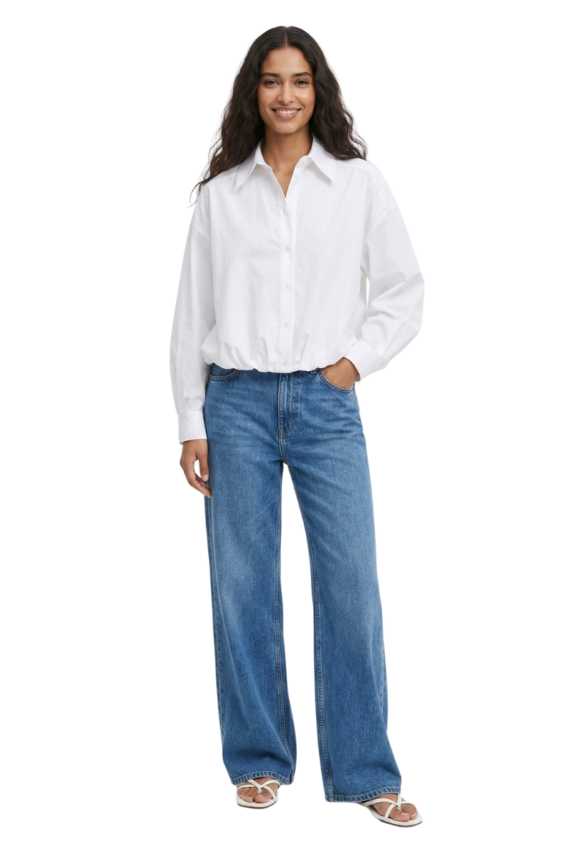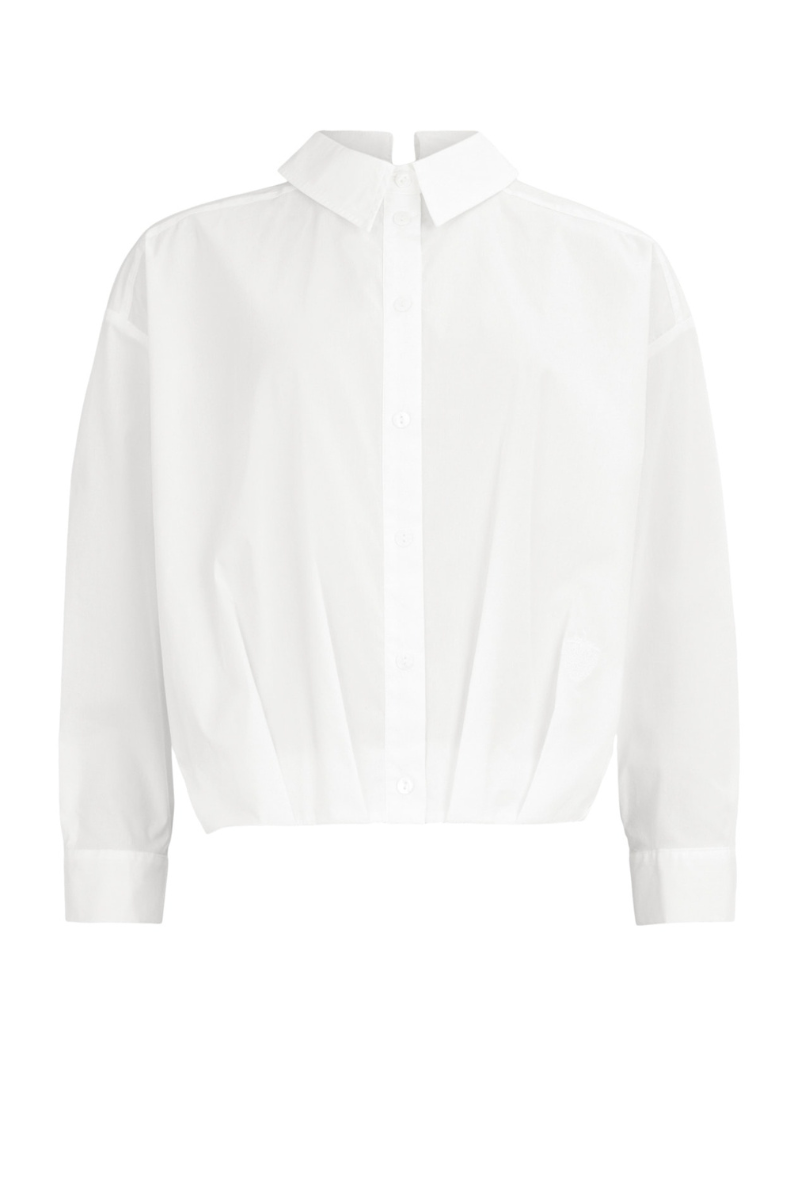 Cute, chic, and comfortable - this white shirt is made from a lightweight cotton blend and has fun unique details including an embroidered strawberry, a gathered pleated from hem, and an elastic back hem. Looks great with jeans or any color pants!