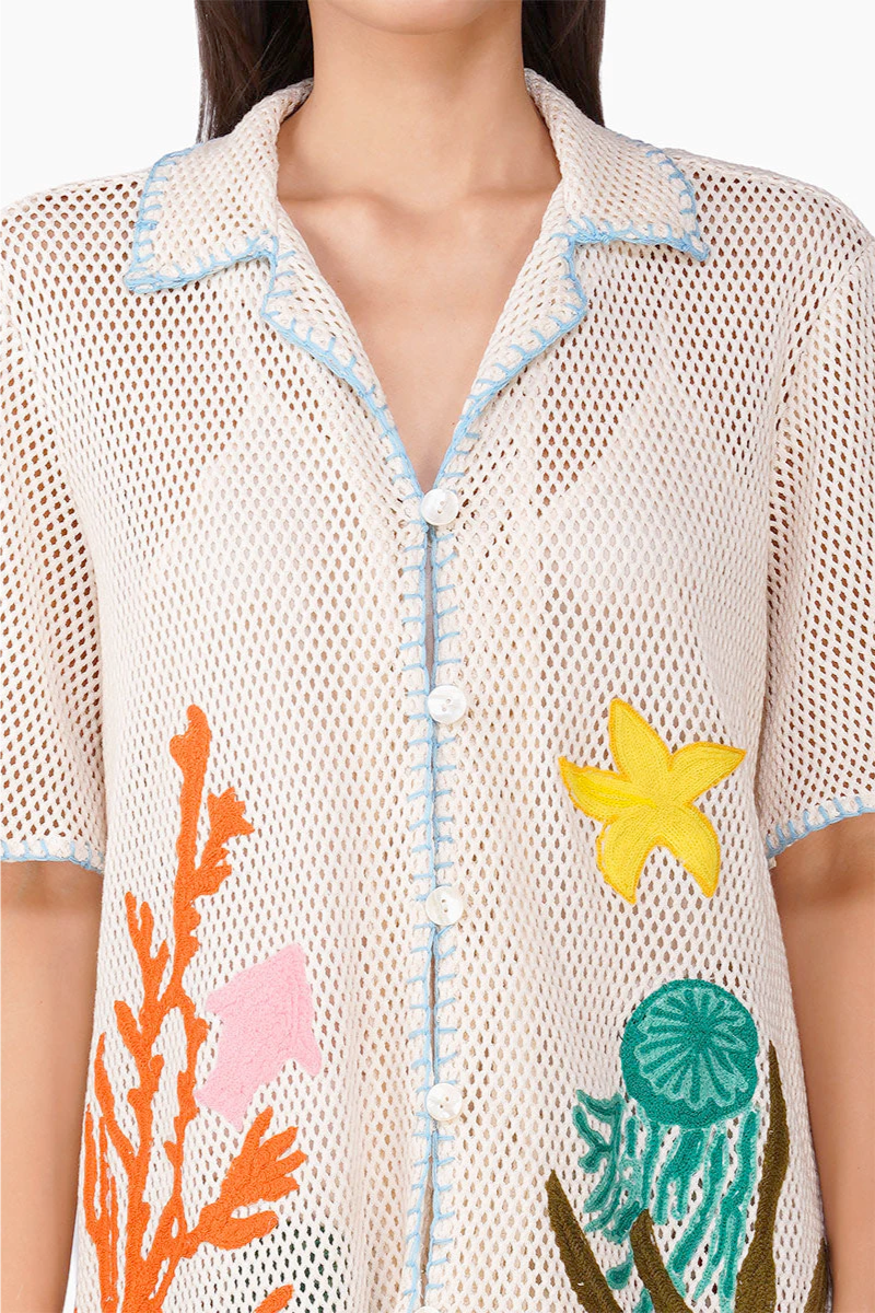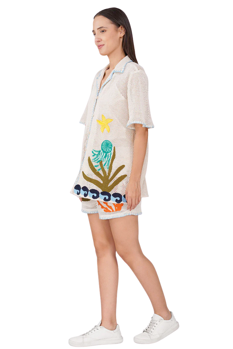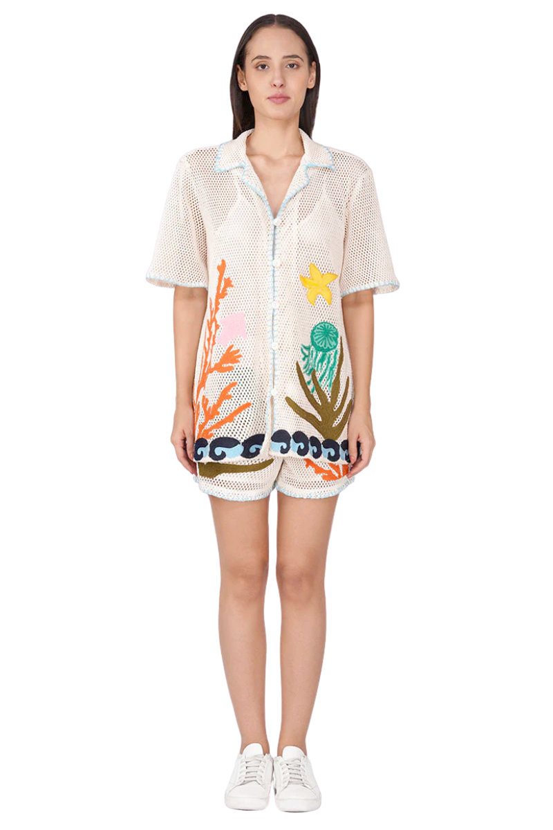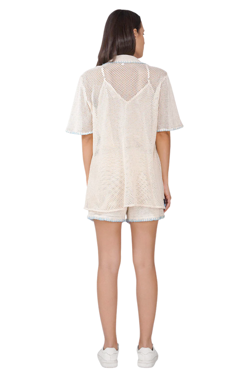 The contrast blanket stitch at the sleeves, collar, and front adds that little extra oomph to make it pop. Pair with a cami, so you're ready to layer and go. Whether you're brunching by the sea or lounging in style, this one's a total wardrobe win.
