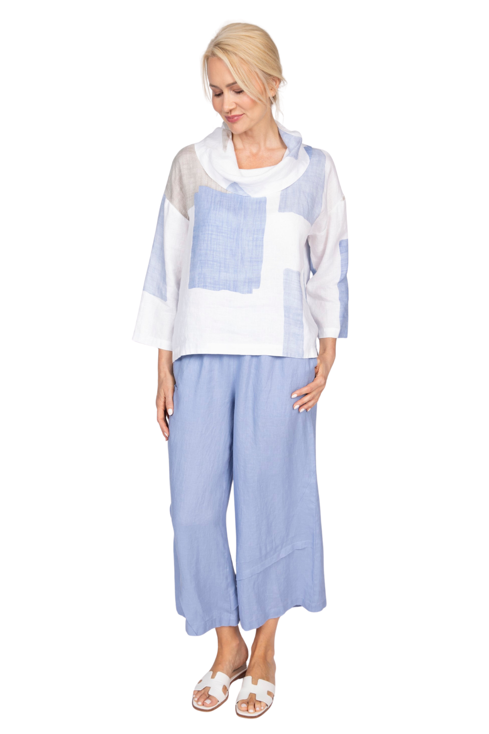 Comfortable, flattering, and chic - these linen pants from Olivia feature asymmetrical diagonal tuck details, side pockets, and an elastic waist. They pair beautifully with Olivia's linen cowl neck tops!