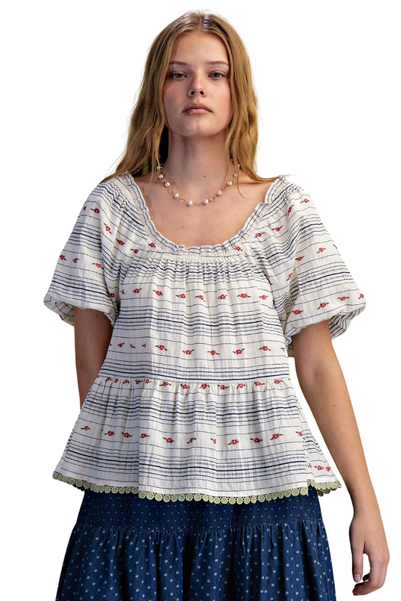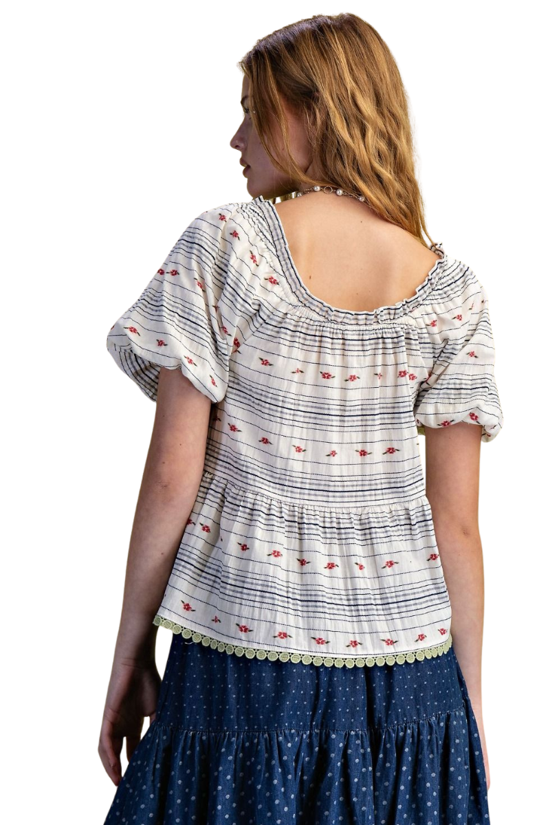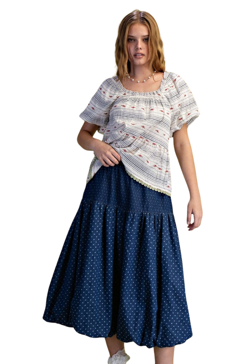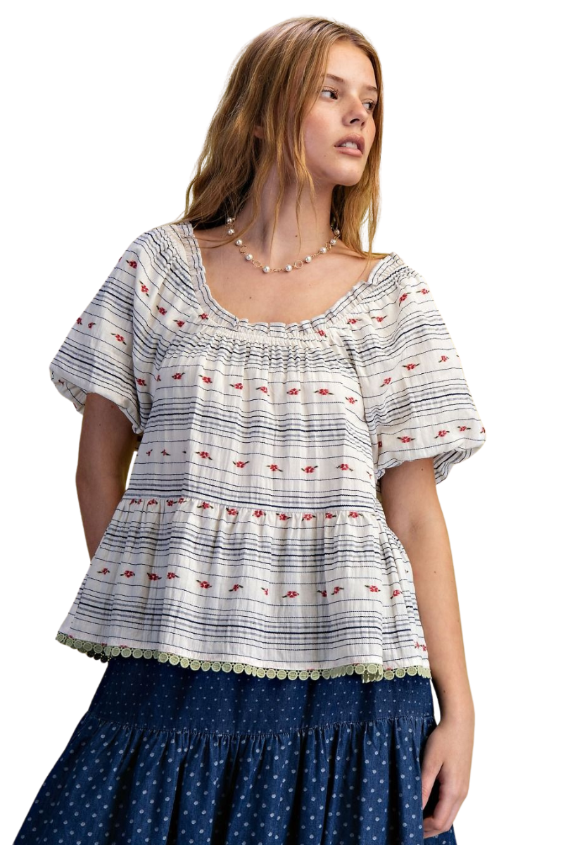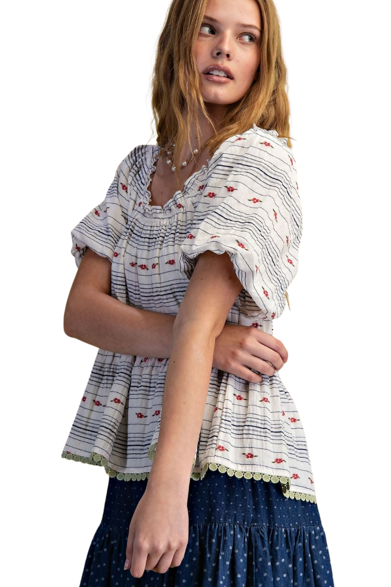 Light green leaves on the tiny flowers compliment the light green hemline trim.