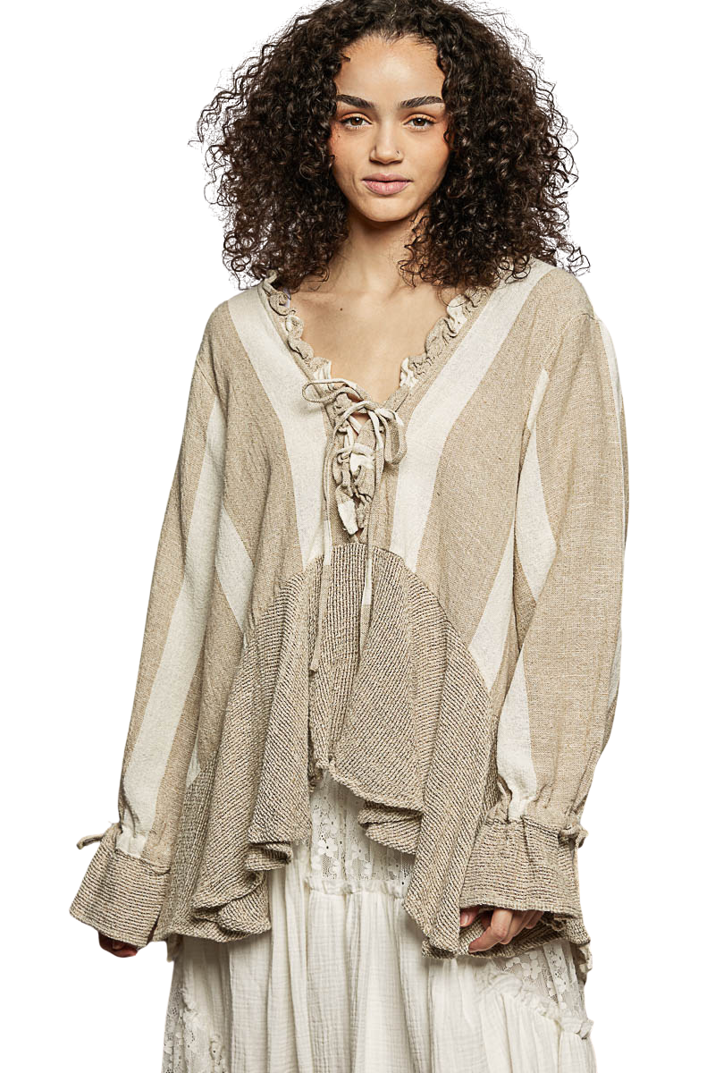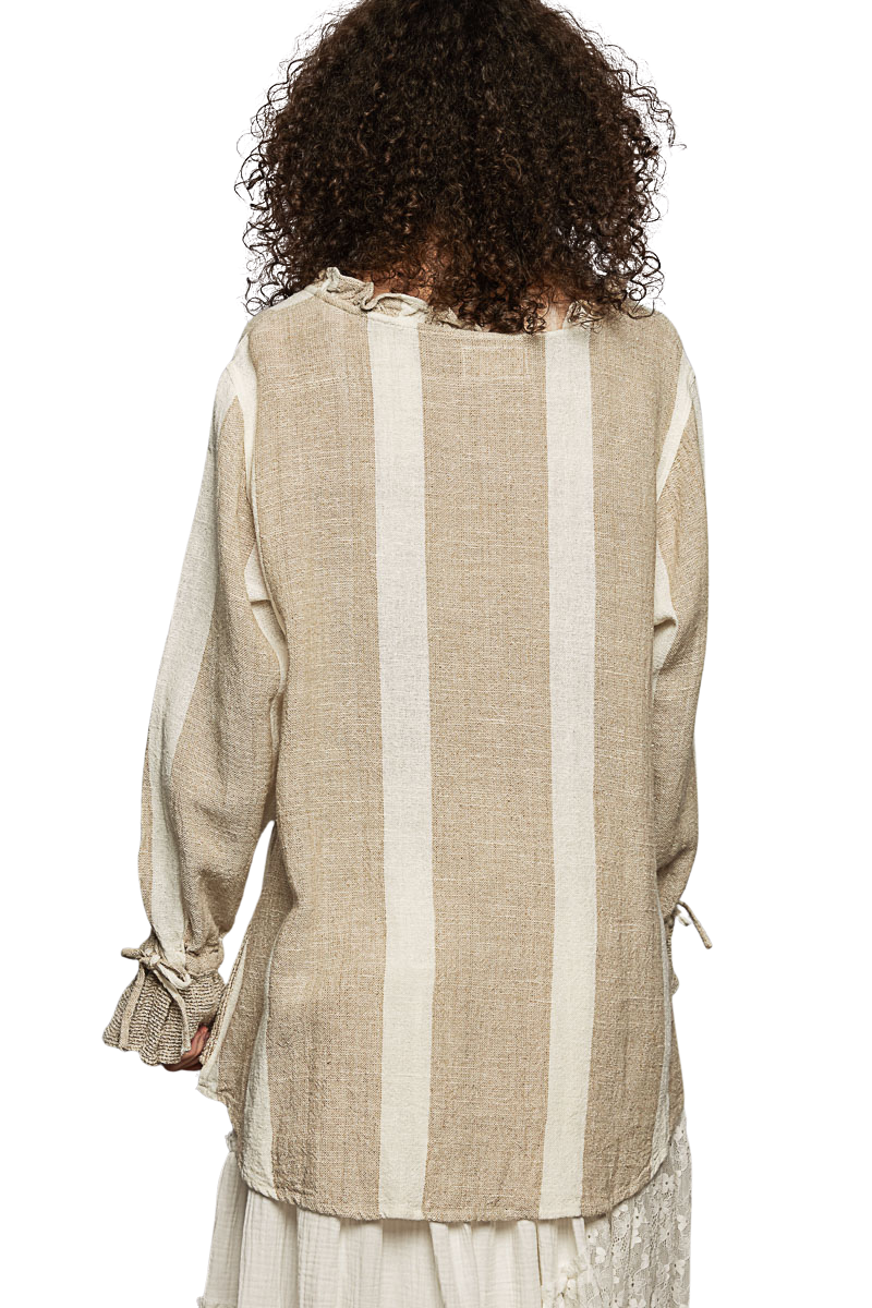 Featuring a delicate neck ruffle with loop detail and flared ruffle opening, the piece is finished with a subtle stripe pattern, while the hem and sleeve cuffs are accented with loosely woven contrast fabric for added texture.