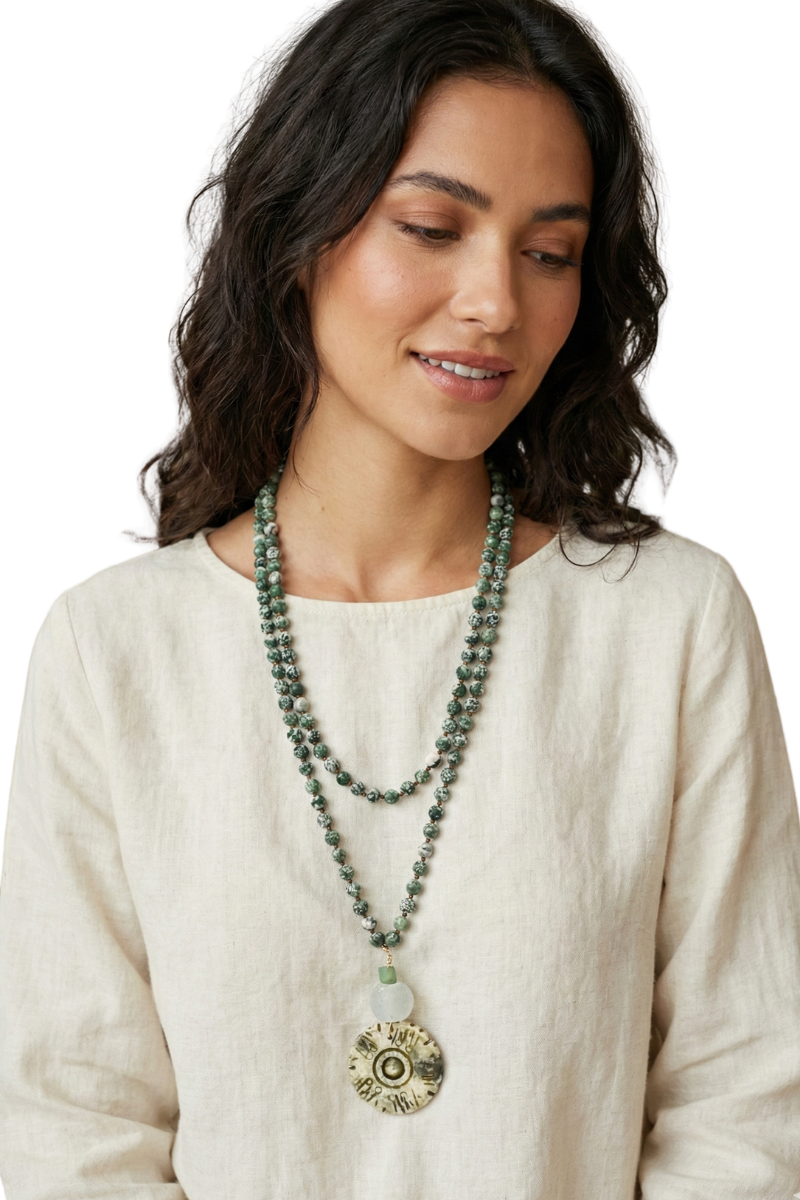 The Long Collection - Green Medallion(0) $38.00 Excl. taxArticle code: BECNLongGreenMake a choiceDefaultMake a choice: *Default - $38.00Add to cartLogin for wishlistBuy NowDescriptionShareThis art necklace is made to be doubled. Simply wrap and put it on. Adjust the lengths to your liking. Green and white marbled stone beads are combined with worn glass and an ancient glyph medallion. Facebook Pin it Whatsapp