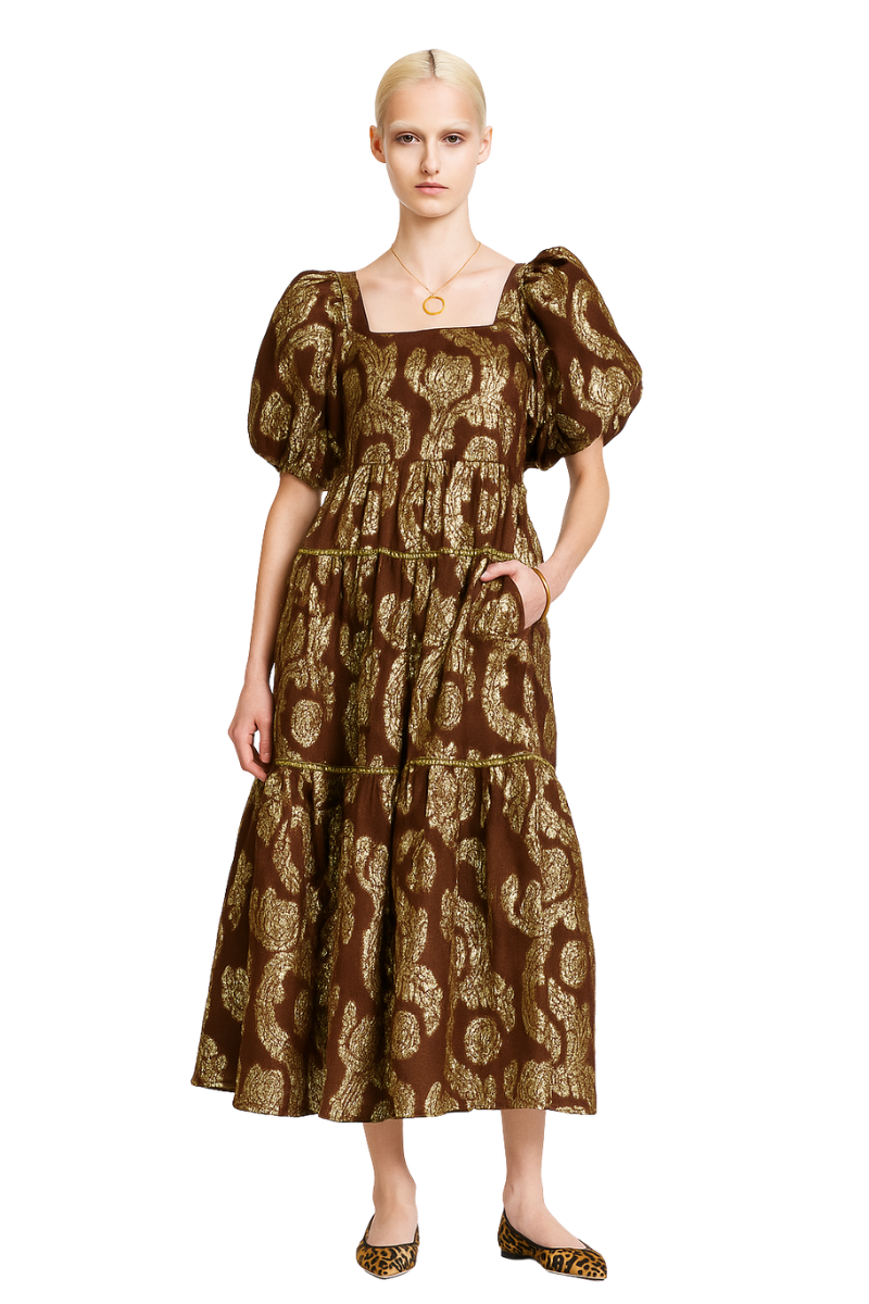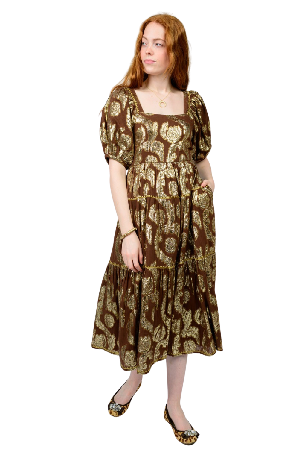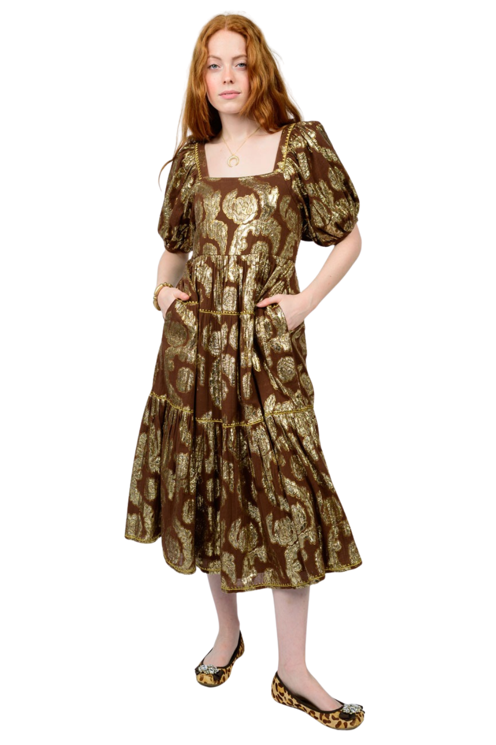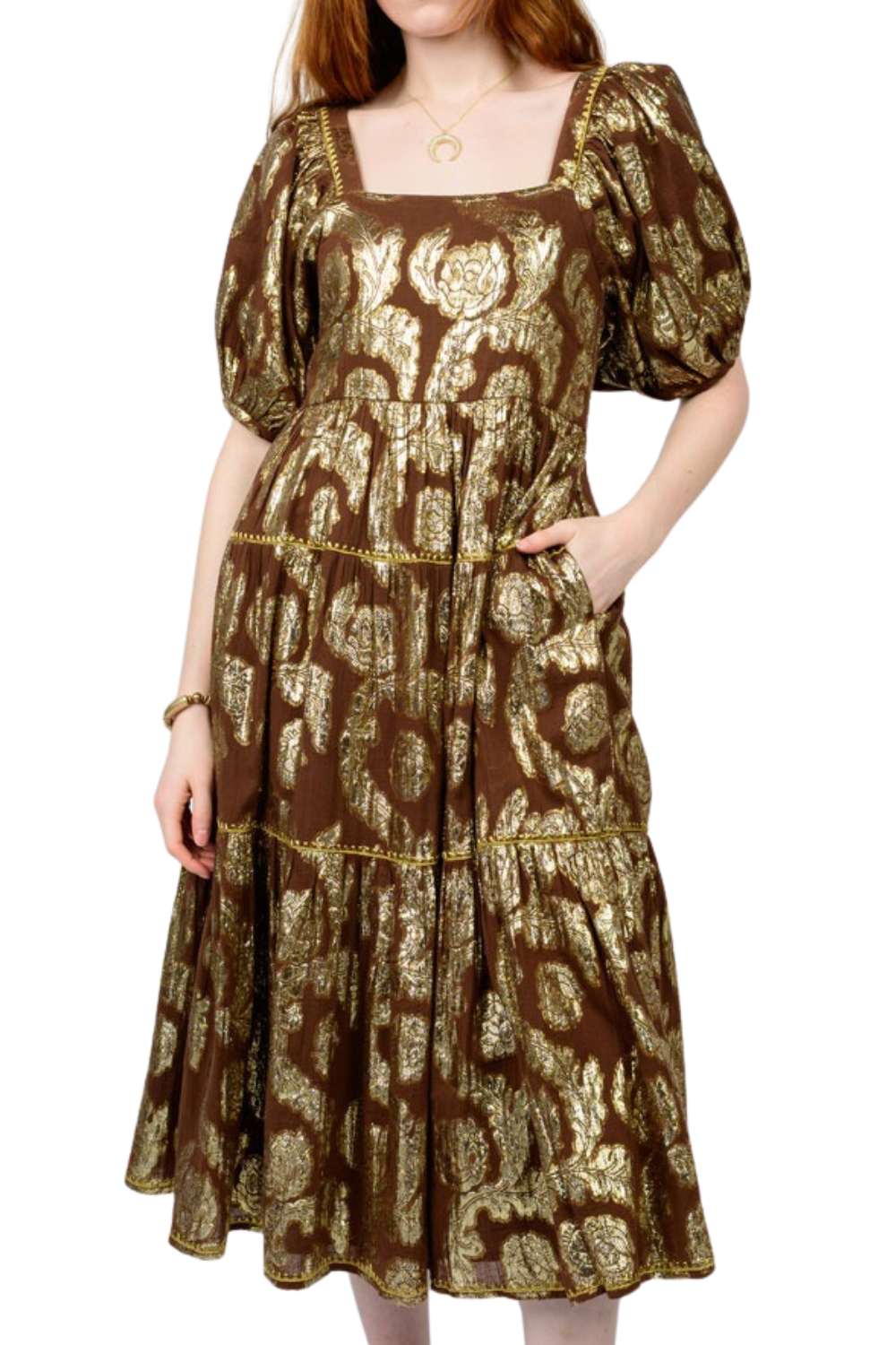 Features: Tiered, elastic back, puff sleeves, square neckline, midi length, side pockets