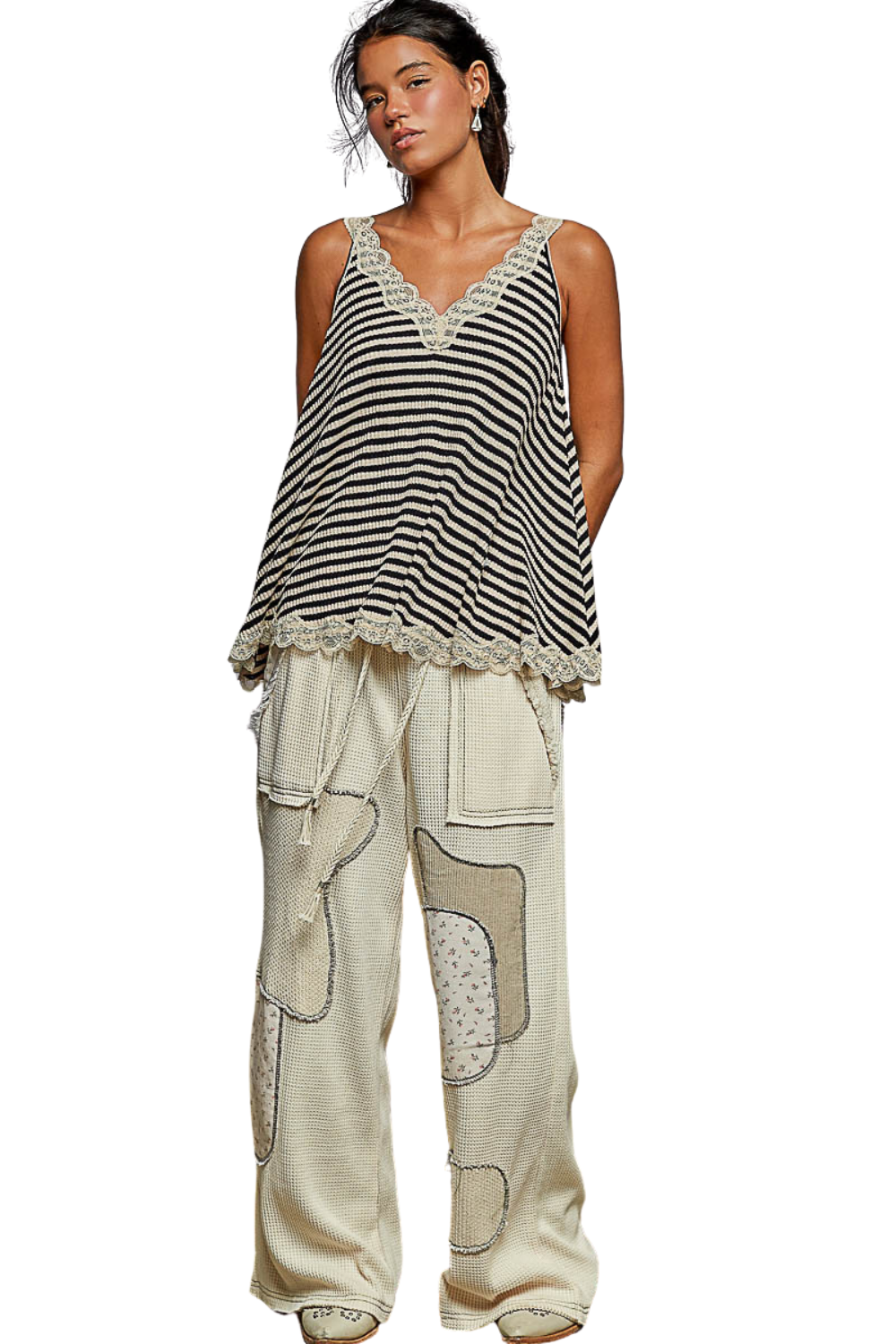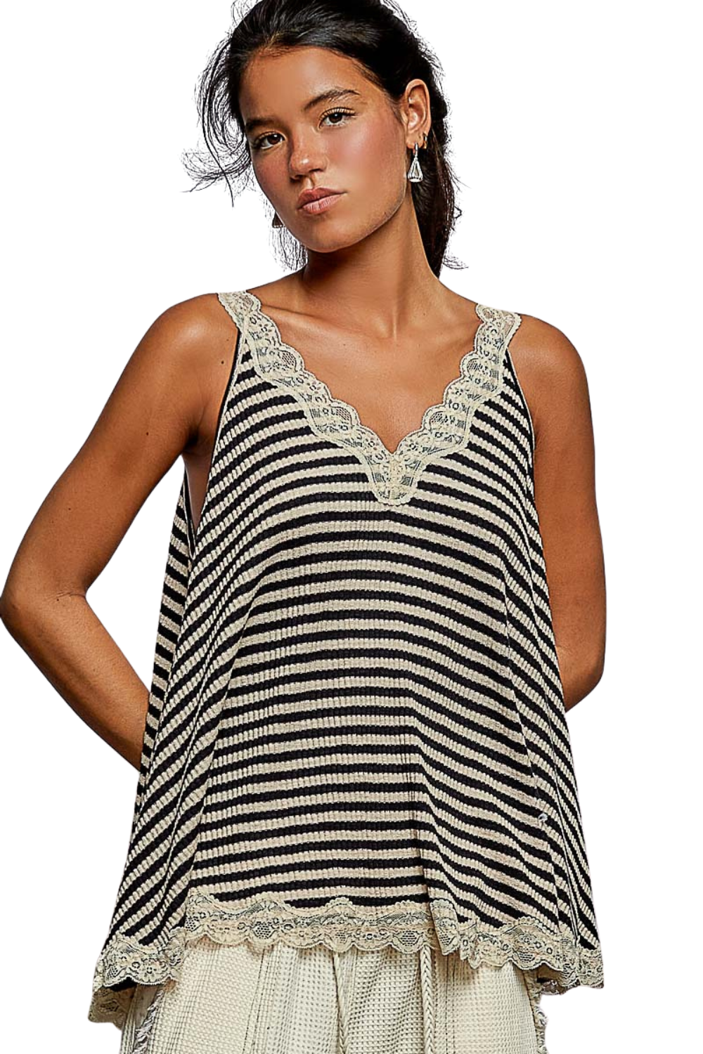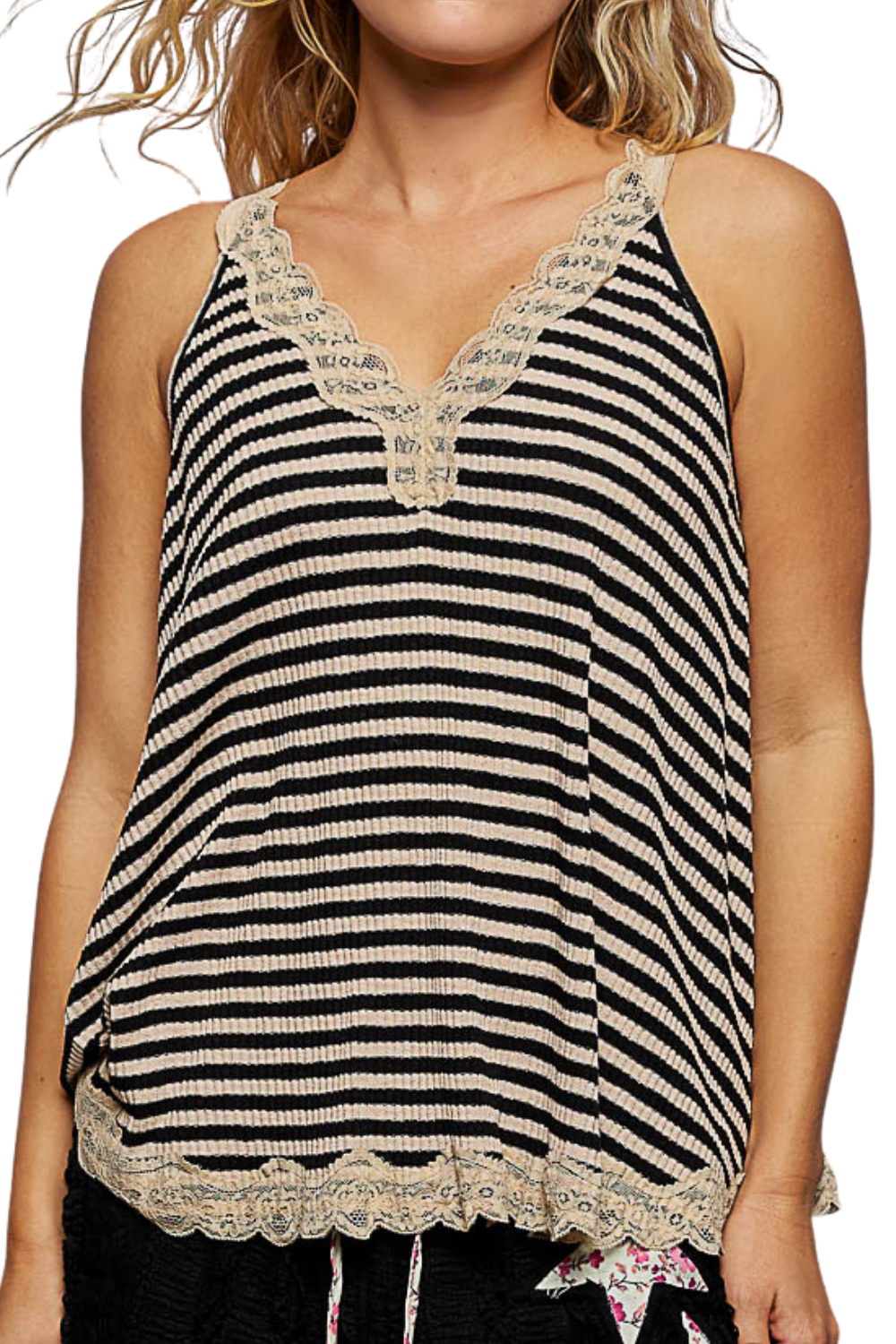 V-Neck Striped Lace Trimed Tank in Sand(0) $33.00 Excl. taxArticle code: POLT1419SandBlkMake a choiceSize : SSize : MSize : LSize: *SMLAdd to cartLogin for wishlistBuy NowDescriptionShareSoft ribbed cotton with delicate lace trim. Perfect for those low cut pieces or your Bohemian look. Facebook Pin it Whatsapp